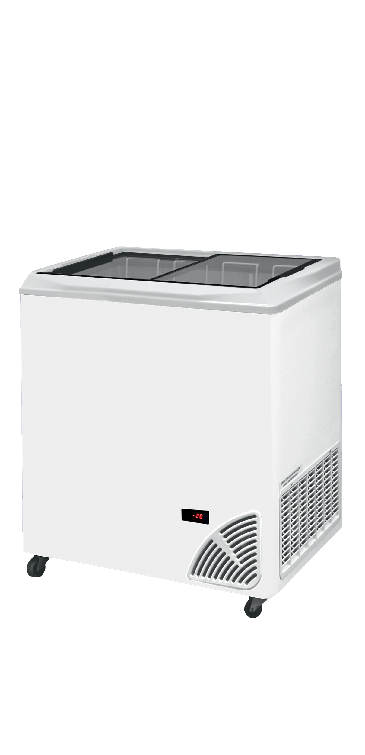 ARO 201/2 White Edge Pultová mraznička prosklené rovné víkoPultová mraznička s posuvným rovným víkem a digitálním termostatem s teploměrem