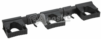 Černá varianta modulárního nástěnného držáku pro uložení hygienického nářadí a pomůcek na pracovišti. Barevné varianty jsou určeny k použití v rámci barevného kódování. Lištu lze snadno připevnit na 4 nástěnné držáky nasunutím z pravé nebo levé strany. K dispozici jsou dva druhy úchytů – jeden pro zavěšení (háček) a jeden pro pevné uchycení. Na lištu lze umístit 1-10 úchytů (Max. 10 háčků na zavěšení nebo max. 5 na pevné uchycení). Úchyt pro pevné uchycení pojme produkty o průměru 28–33 mm. Háček udrží produkty o hmotnosti až 3 kg. Systém se dodává se 3 úchyty pro pevné uchycení a 2 háčky. Produkt lze snadno rozebrat za účelem čištění nebo výměny.