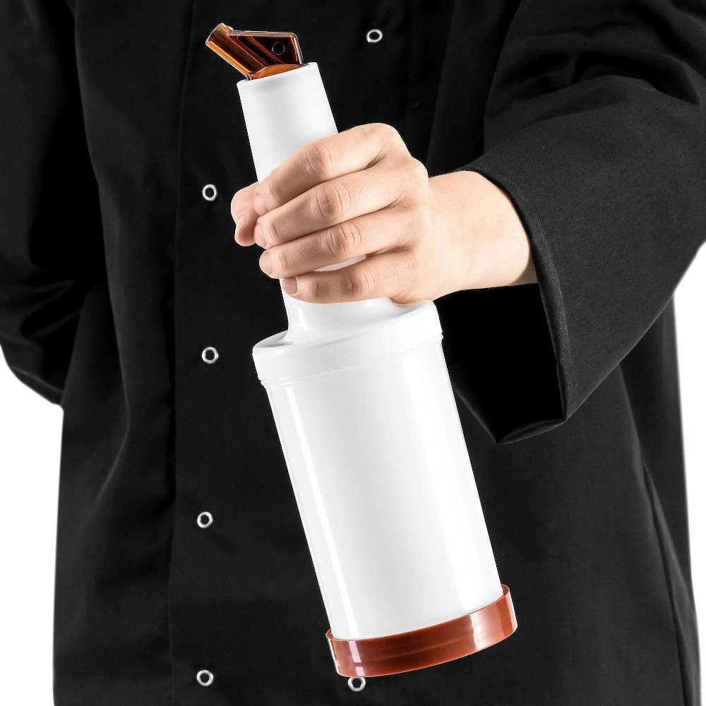 Barmanský dávkovač hnědý objem 1 l FORGAST FG03241 je praktický nástroj určený pro pohodlné skladování a přesné dávkování různých druhů omáček. Produkt se vyznačuje pevnou konstrukcí z odolného polyetylenu a charakteristickou hnědou barvou doplňků, což z něj činí ideální volbu jak pro profesionální bary, tak restaurace a domácí kuchyně.