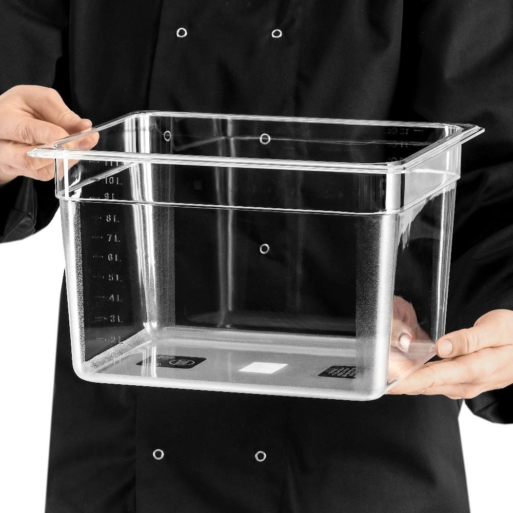 GN 1/2 kontejner z polykarbonátu o hloubce 20 cm Značka Forgast představuje estetický způsobóskladování a vystavování potravin v teplotním rozmezí -40 až +99ºC. Lze ji proto použít v chladírnách, ledárnách aósalátových pultech. Průhledný materiál umožňuje rychlou identifikaci obsahu bez nutnosti otevření nádoby. Mezi nesporné výhody polykarbonátu patří jeho vysoká odolnost proti nárazu a mechanickému poškození. Polykarbonát neabsorbuje žádné látky ani pachy a nezkresluje chuť skladovaných potravin.