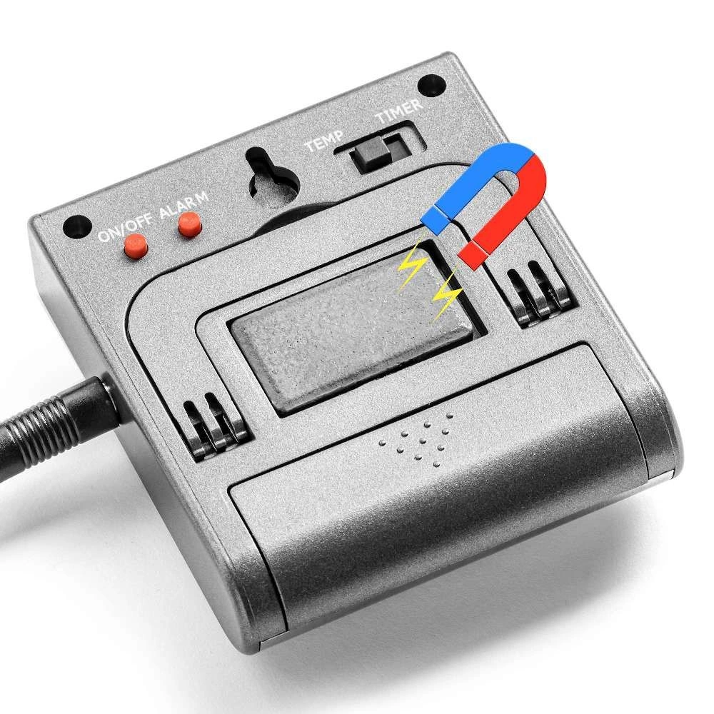 - Celkové rozměry: 6,4 x 7,2 x 7,8 cm – kompaktní velikost umožňuje snadné umístění teploměru na pracovní desku, zavěšení nebo připevnění magnetem na kovový povrch.
