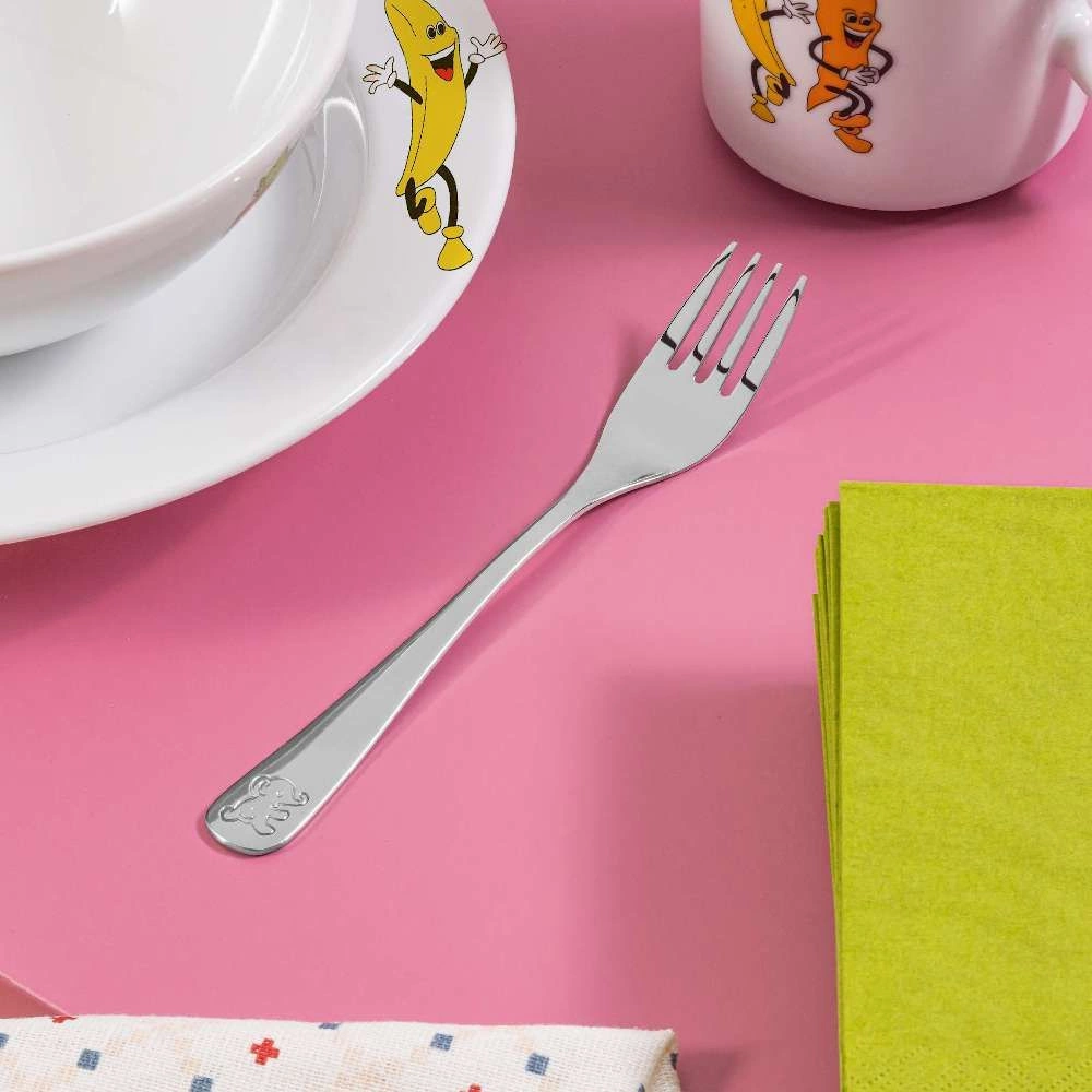 Stolní vidlička Značka Forgast z DĚTI ;Tato řada je vyrobena z nerezové oceli 18/8 a je ideální pro jesle a mateřské školy - je speciálně navržena pro malé děti. Díky roztomilému vzoru slonů na rukojeti vidličky je to skvělá volbaór pro každé malé dítě. Vysoce kvalitní zpracování.