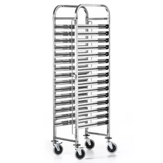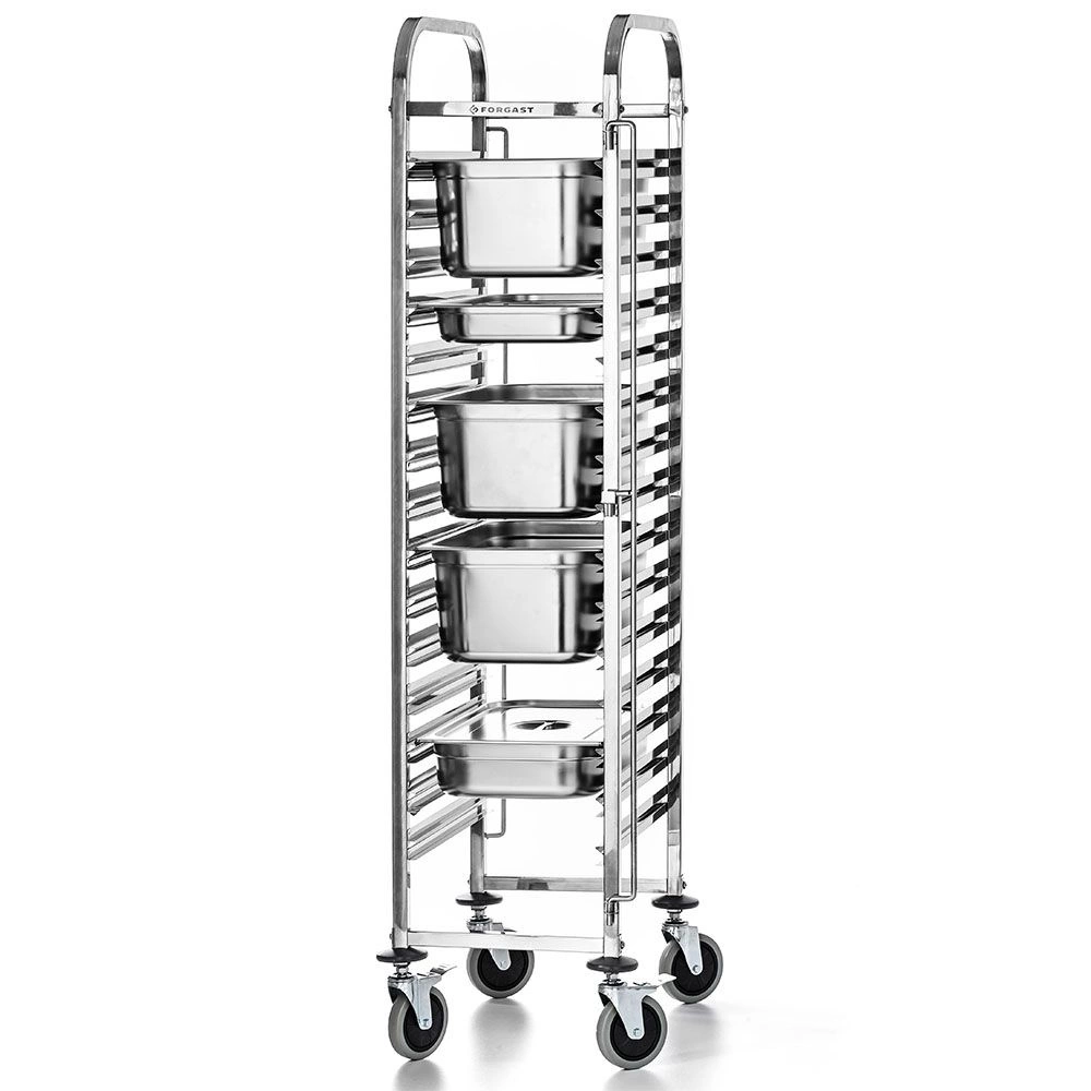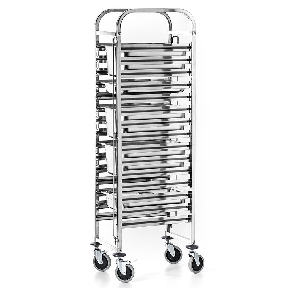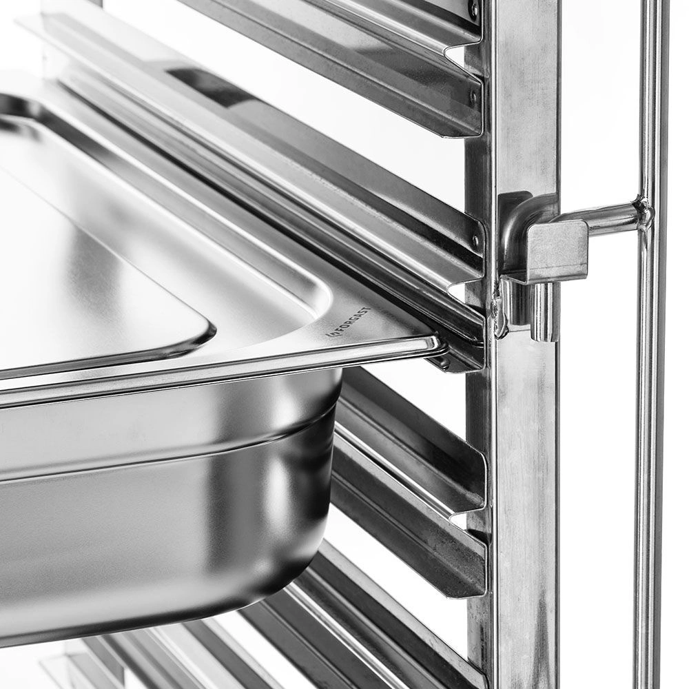 - Kapacita: 15 GN 1/1 nádob – umožňuje současný transport velkého množství nádob, což výrazně zvyšuje efektivitu práce v kuchyni.