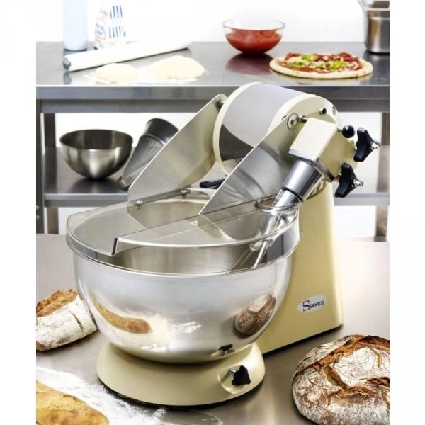 Spirálový mixér Santos 18 byl navržen s ohledem na dlouhodobé a intenzivní používání. Nádoba je vyrobena z vysoce kvalitní nerezové oceli, což zajišťuje její odolnost a ochranu proti korozi. Kryt zařízení je kombinací hliníkové slitiny a smaltovaného plechu, díky čemuž je celek lehký a zároveň pevný. Průhledné víko chrání uživatele před kontaktem s otáčející se spirálou a zároveň umožňuje kontrolu nad procesem hnětení těsta. Součástí sady je mixér s nádobou a ochranným víkem.