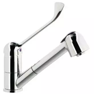 Umyvadlová baterie s výsuvnou sprchou. . Jednootvorový, kolenový s variabilním proudem vody. Požadovaný otvoróv dřezu 33-35 mm.