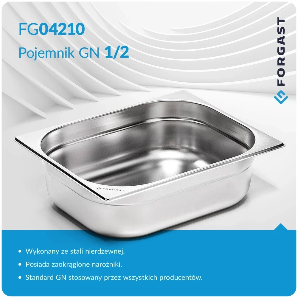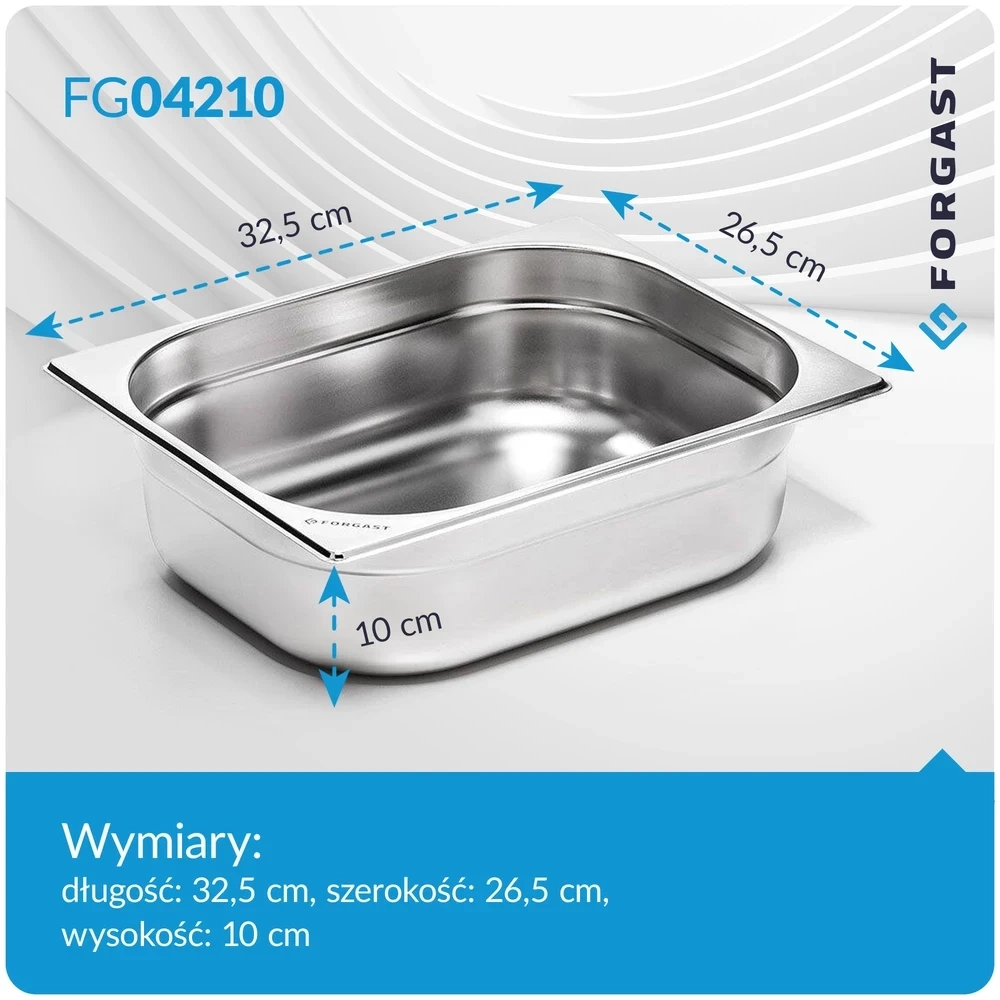 Nádoba GN 1/2 hloubka 10 cm FORGAST FG04210 je spolehlivým řešením pro všechny, kteří si cení odolnosti, univerzálnosti a snadného používání. Nerezová ocel zajišťuje odolnost vůči vysokým teplotám a chemikáliím a pevná konstrukce garantuje dlouhodobé používání i při intenzivní zátěži. Výběrem této nádoby investujete do bezpečnosti, hygieny a pohodlí práce v kuchyni.