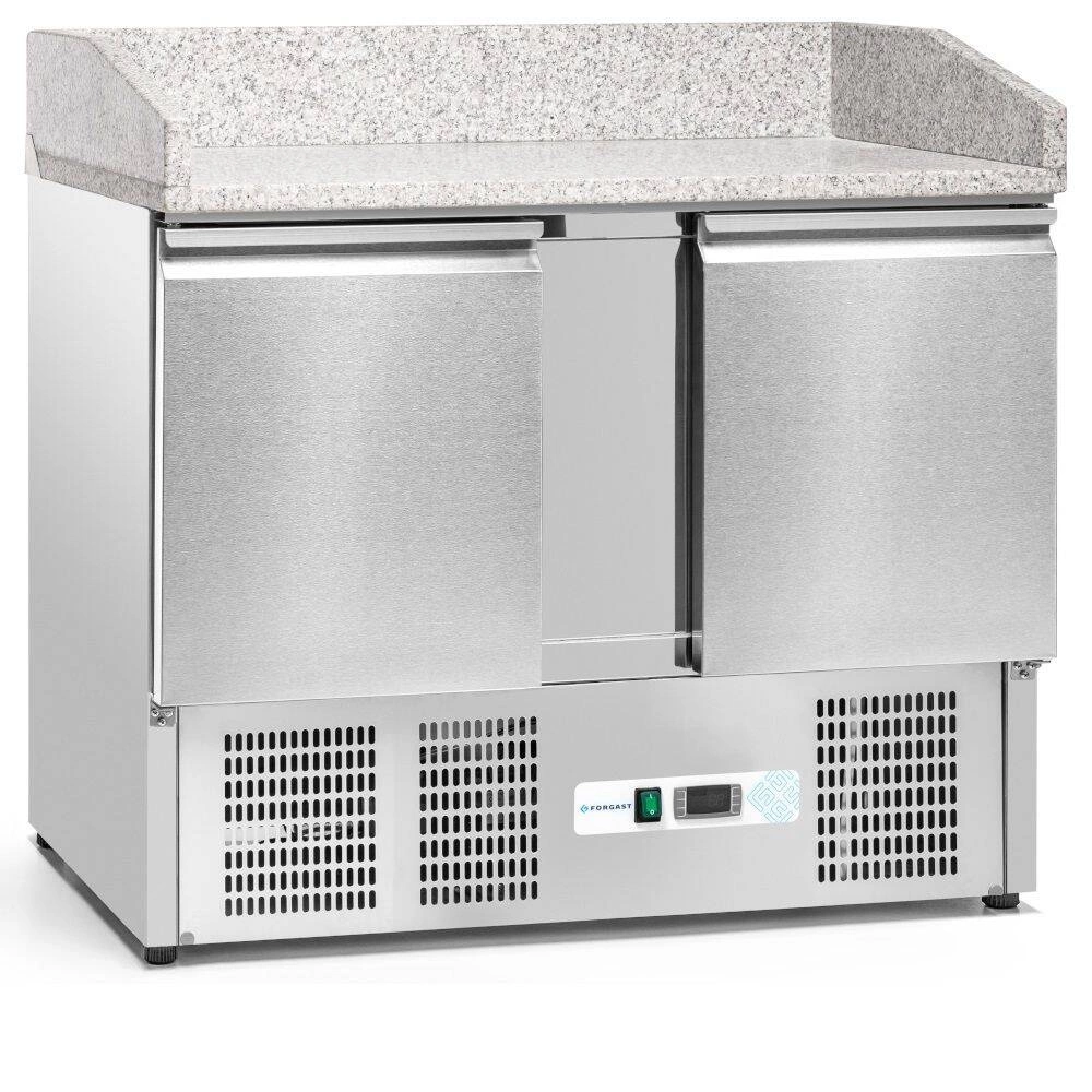 Chladicí stůl na pizzu se dvěma dveřmi značky Forgast je profesionální chladicí zařízení určené pro intenzivní použití v gastronomii, zejména v pizzeriích a restauracích podávajících studené pokrmy. Jeho charakteristickými vlastnostmi jsou prostorné dvoudveřové tělo z nerezové oceli a robustní žulová pracovní deska s vysokým lemem, ideální pro přípravu těsta a skládání pizzy. Zařízení zajišťuje vhodné podmínky pro skladování surovin a zároveň pohodlný a hygienický pracovní prostor.