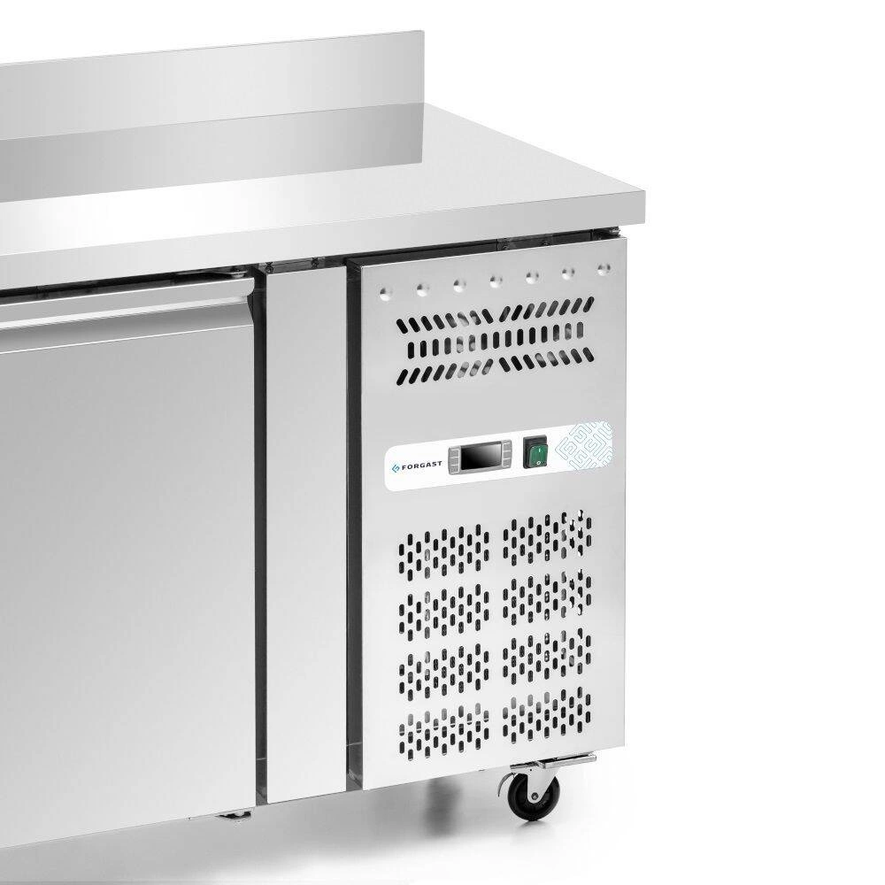 Chladicí stůl Forgast je vybaven třemi nezávislými chladicími komorami, z nichž každá je uzavíratelná samostatnými dveřmi s pohodlným, tvarovaným madlem po celé délce. Vnitřek každé komory obsahuje polici přizpůsobenou pro nádoby GN 1/1, což umožňuje flexibilní uspořádání produktů. Zadní část pracovní desky má lem o výšce 10 cm, který chrání stěnu před znečištěním. Zaoblené rohy komory zabraňují hromadění nečistot a usnadňují každodenní údržbu zařízení. Součástí balení jsou tři police a snadno vyjímatelné těsnění dveří, což výrazně usnadňuje údržbu a zajišťuje vysokou úroveň hygieny.