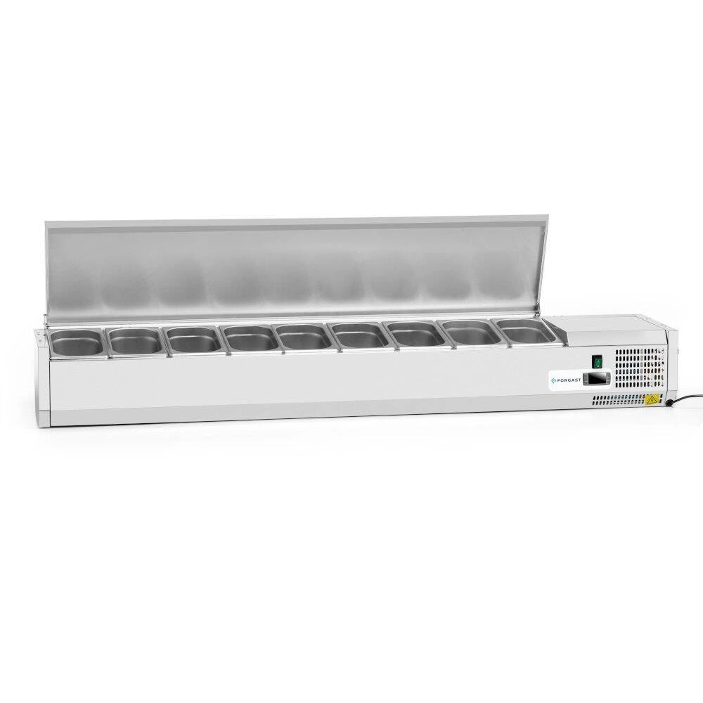 Chladicí nástavec FORGAST FG07309 je profesionální chladicí zařízení určené pro skladování a prezentaci potravinářských surovin v gastronomii. Vyniká vysokou kvalitou zpracování z nerezové oceli a možností současného umístění až devíti nádob GN 1/4. Ideální pro restaurace, pizzerie, salátové bary nebo rychlá občerstvení, kde je důležitý komfort práce, čerstvost produktů a hygiena.