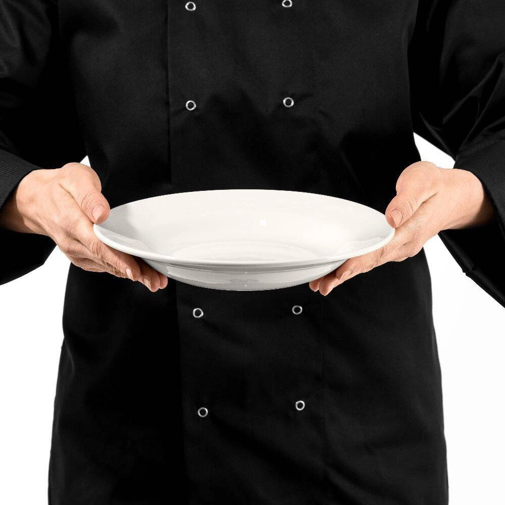 - Gładka powierzchnia i elegancki kolor: Szkliwiona, śmietankowa powierzchnia nie tylko prezentuje się stylowo, ale także ułatwia czyszczenie i nie wchodzi w reakcje z żywnością. Dzięki temu talerz zachowuje swój wygląd nawet po intensywnym użytkowaniu i częstym myciu w zmywarkach przemysłowych.