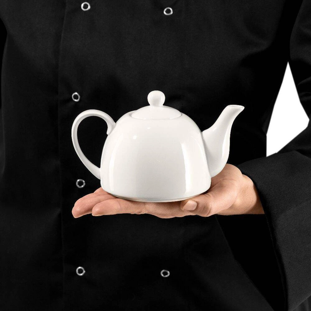 Dzbanek na herbatę porcelanowy Modermo Prima, 300 ml MODERMO MP003 to eleganckie naczynie, które wyróżnia się śmietankowym kolorem oraz klasycznym kształtem. Wykonany z porcelany z dodatkiem tlenku glinu, zapewnia wyjątkową trwałość i odporność na codzienne użytkowanie. Idealny zarówno do serwowania herbaty w domu, jak i podczas profesjonalnych spotkań w restauracjach czy hotelach.