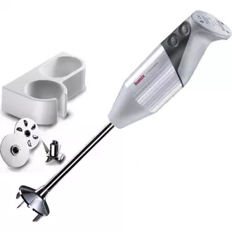 Ruční mixér BAMIX Gastro 200 pro míchání potravin v hrncích, aniž by bylo nutné měnit jejich obsah. Je také skvělý pro přípravu omáček pěn krémů šlehačky apod. pomocí šlehacího kotouče. Spotřebič má 19 cm dlouhé mixovací rameno. Maximální ponor mixovacího ramene/tyče je 2/3 délky.