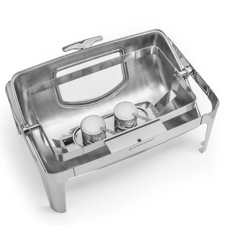 Ohřívač FORGAST FG03118 je vyroben z odolné oceli, což zajišťuje odolnost vůči mechanickému poškození a snadnou údržbu. Roll-top víko se plynule otevírá až do 180 stupňů, což usnadňuje servírování jídel i samoobsluhu během bufetů a konferencí. Průhledný průzor umožňuje průběžnou kontrolu obsahu bez nutnosti zvedání víka, což minimalizuje tepelné ztráty. Součástí sady je GN 1/1 nádoba o hloubce 6,5 cm, ideální pro servírování různých pokrmů, a dva zásobníky na palivové dózy, které umožňují dlouhodobý ohřev jídel.