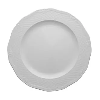 Mělký talíř z řady Afrodyta od Lubiany o průměru 27 cm. Zdobený porcelán v čistě bílé barvě. Odolný glazovaný povrch. Vhodné do myčky nádobí a mikrovlnné trouby.