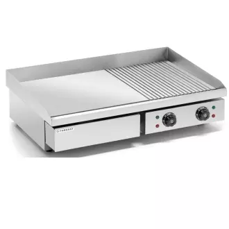 • Dvouzónová pracovní plocha: Deska je rozdělena na dvě části – 2/3 hladkou a 1/3 rýhovanou. To umožňuje současné grilování různých produktů, například masa na rýhované části a vajec či zeleniny na části hladké. Toto řešení zvyšuje univerzálnost zařízení v profesionální kuchyni.