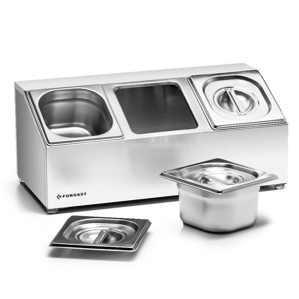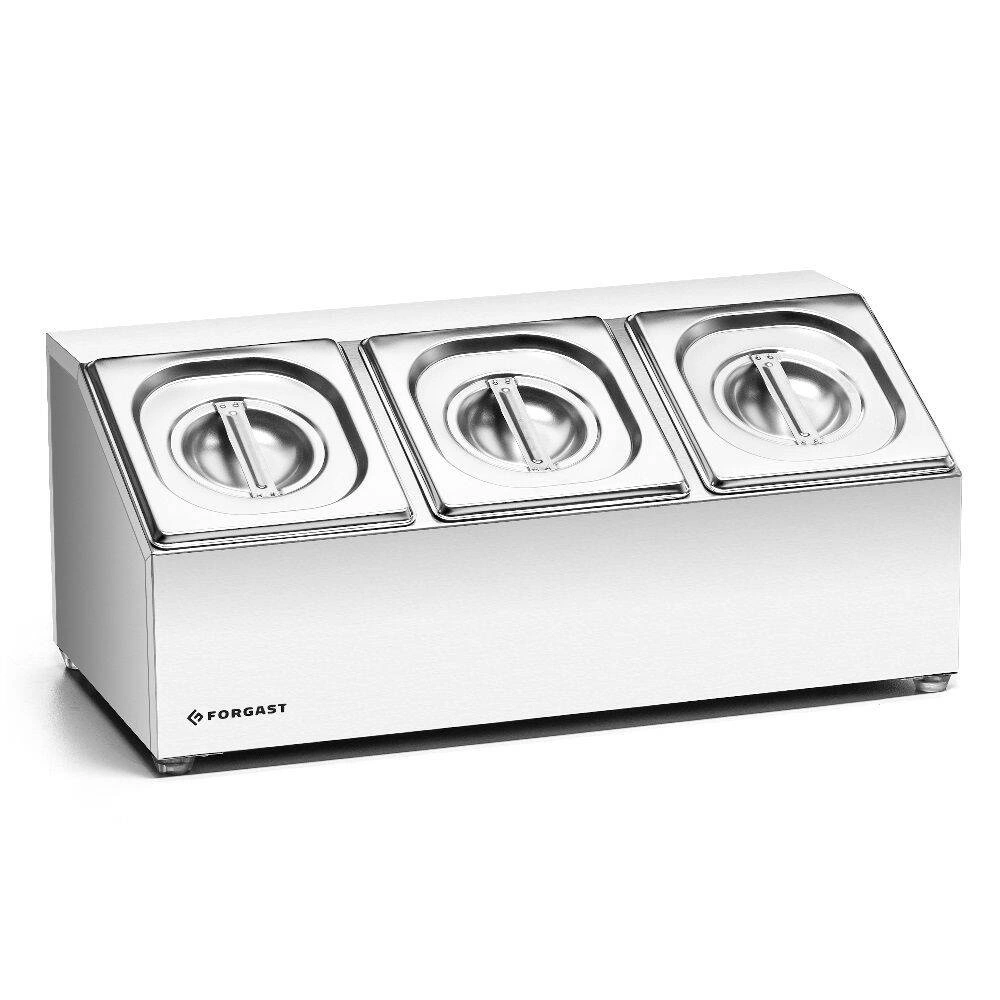 Expozitor na potraviny značky Forgast je profesionálním řešením pro prezentaci a uchovávání jídel v gastronomii. Tento produkt se vyznačuje provedením z nerezové oceli a možností současného uložení tří GN 1/6 nádob. Skvěle se hodí do restaurací, salátových barů, bufetů či jídelen, kde záleží na estetickém servírování a hygieně.