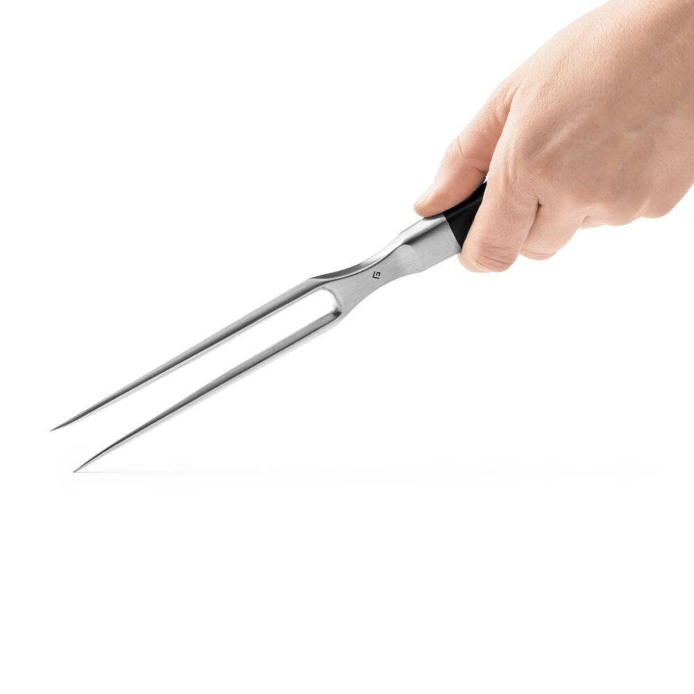 - Vysoce kvalitní kovaná ocelová tyč – vidlička je vyrobena z jednoho kusu kované ocelové tyče, což jí zajišťuje výjimečnou odolnost vůči mechanickému poškození a deformacím i při intenzivním používání v gastronomii.