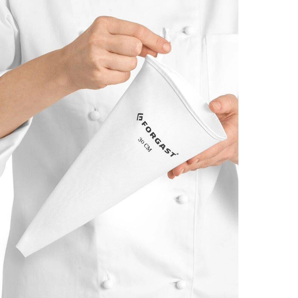 Bavlněný sáček na vytlačování krému o délce 30 cm značky FORGAST je nenahraditelným nástrojem v každé profesionální i domácí cukrářské kuchyni. Výrobek je vyroben z vysoce kvalitní bavlny a vybaven praktickým poutkem, což zajišťuje pohodlí při používání a udržení vysoké úrovně hygieny během práce. Ideální pro precizní zdobení dortů, koláčů nebo přípravu dalších dezertů vyžadujících aplikaci krémů a náplní.