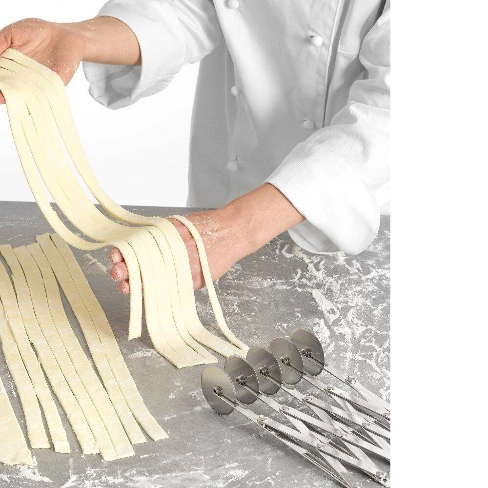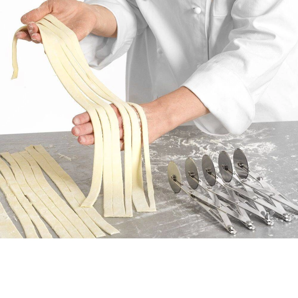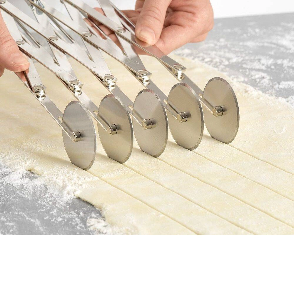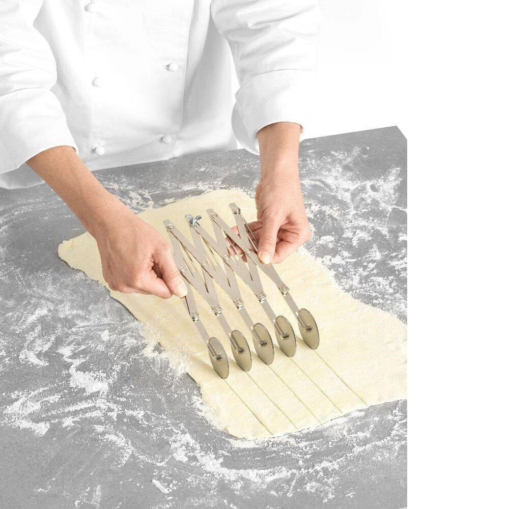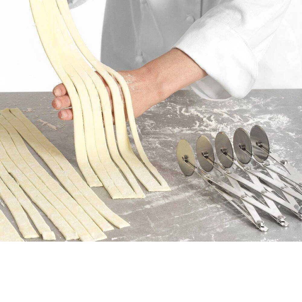 - Pět nerezových čepelí – každá z pěti čepelí je vyrobena z odolné nerezové oceli, což zajišťuje dlouhou životnost a odolnost proti korozi i při intenzivním používání. Čepele zaručují hladké a rovné řezy, což je nezbytné při přípravě sušenek, těstovin nebo listového těsta.