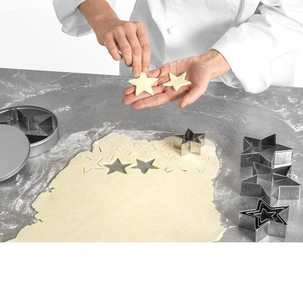 Sada vykrajovátek ve tvaru hvězdy je praktická souprava určená jak pro profesionální cukráře, tak i pro nadšence domácího pečení. Skládá se z 9 dílů různých velikostí, díky čemuž je ideální pro přípravu sušenek, zdobení dortů i dekorací na výjimečné příležitosti. Vyniká odolným provedením a snadným používáním.