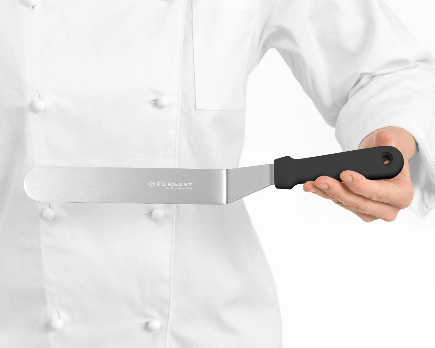 - Zahnutá konstrukce: Speciálně tvarovaná špička usnadňuje práci při uhlazování boků a vrchu dortů a také umožňuje snadné přenášení hotových pečených výrobků na talíř nebo podnos.
