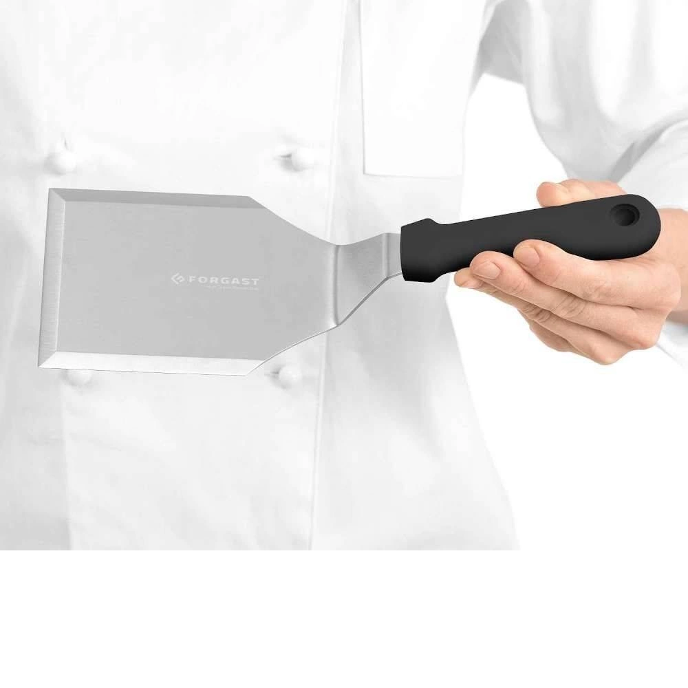 Lopatka na hamburgery FORGAST FG11221 je robustní kuchyňský nástroj určený pro profesionální použití na grilu, v restauraci nebo v domácí kuchyni. Vyznačuje se širokou pracovní plochou a provedením z nerezové oceli, což zajišťuje dlouhou životnost a pohodlí při používání. Ideální pro přípravu burgerů, steaků a dalších pokrmů, které vyžadují obracení nebo přenášení na horké plotně.