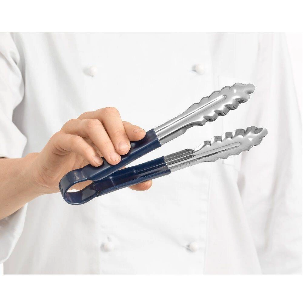 Kleště jsou vyrobeny z vysoce kvalitní nerezové oceli, což jim zajišťuje odolnost vůči intenzivnímu používání a častému mytí v myčkách. Ergonomická rukojeť potažená odolným plastem v modré barvě zaručuje jistý úchop i při práci v rukavicích nebo ve vlhkém prostředí. Kleště jsou univerzální – skvěle se hodí pro servírování pokrmů na výdejních linkách, samoobslužných bufetech i při přípravě jídel v hotelových či restauračních kuchyních. Výrobek neobsahuje žádné další příslušenství – v balení je jedna sada kleští.