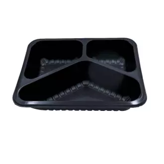 Tříkomorová nádoba na oběd o rozměrech 22,7x17,8x4 cm pro jídla s sebou. Nádoba je vyrobena z černého recyklovatelného polypropylenu. Určeno pro uzavírání jídla s sebou v uzavíracích strojích.