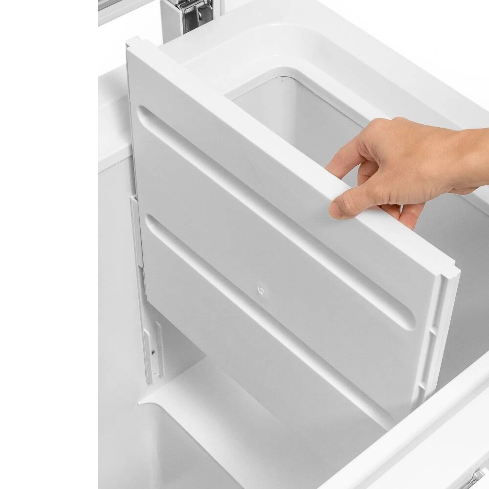 Součástí sady jsou dva koše na mražené produkty, které umožňují pohodlné třídění a rychlý přístup k nejčastěji používaným položkám. Přepážka umožňuje skladování různých skupin produktů bez rizika jejich vzájemného kontaktu. Zámek v madle chrání obsah před nepovolaným přístupem, což je zvláště důležité na veřejných místech. Kolečka s brzdou výrazně usnadňují přesouvání mrazničky a její umístění na zvoleném místě, a odtok ve dně komory umožňuje rychlé a hygienické odmrazování zařízení.