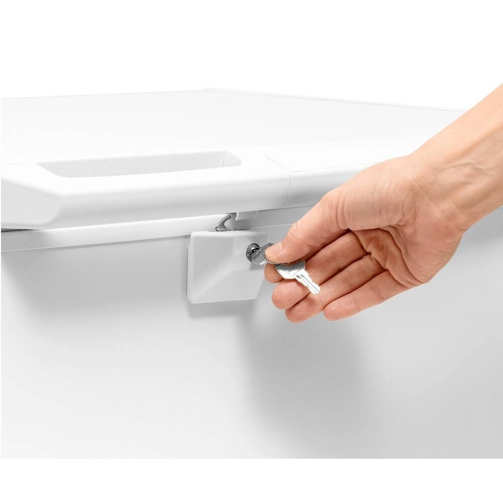 - Bezpečnost a pohodlí při používání – mraznička je vybavena víkem s bezpečnými panty, které jej udržují v otevřené poloze, a také madlem se zámkem, chránícím obsah před nepovolanými osobami.