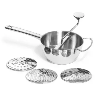 Sada obsahuje síto a tři vyměnitelné kotouče, které lze snadno měnit podle potřeby. Taková konfigurace umožňuje univerzální využití produktu – od pasírování brambor na kaši, přes přípravu rajčatového pyré, až po výrobky na bázi jiné zeleniny a ovoce. Síto je určeno pro ruční práci a nevyžaduje napájení, což z něj činí spolehlivý nástroj v každé kuchyni.