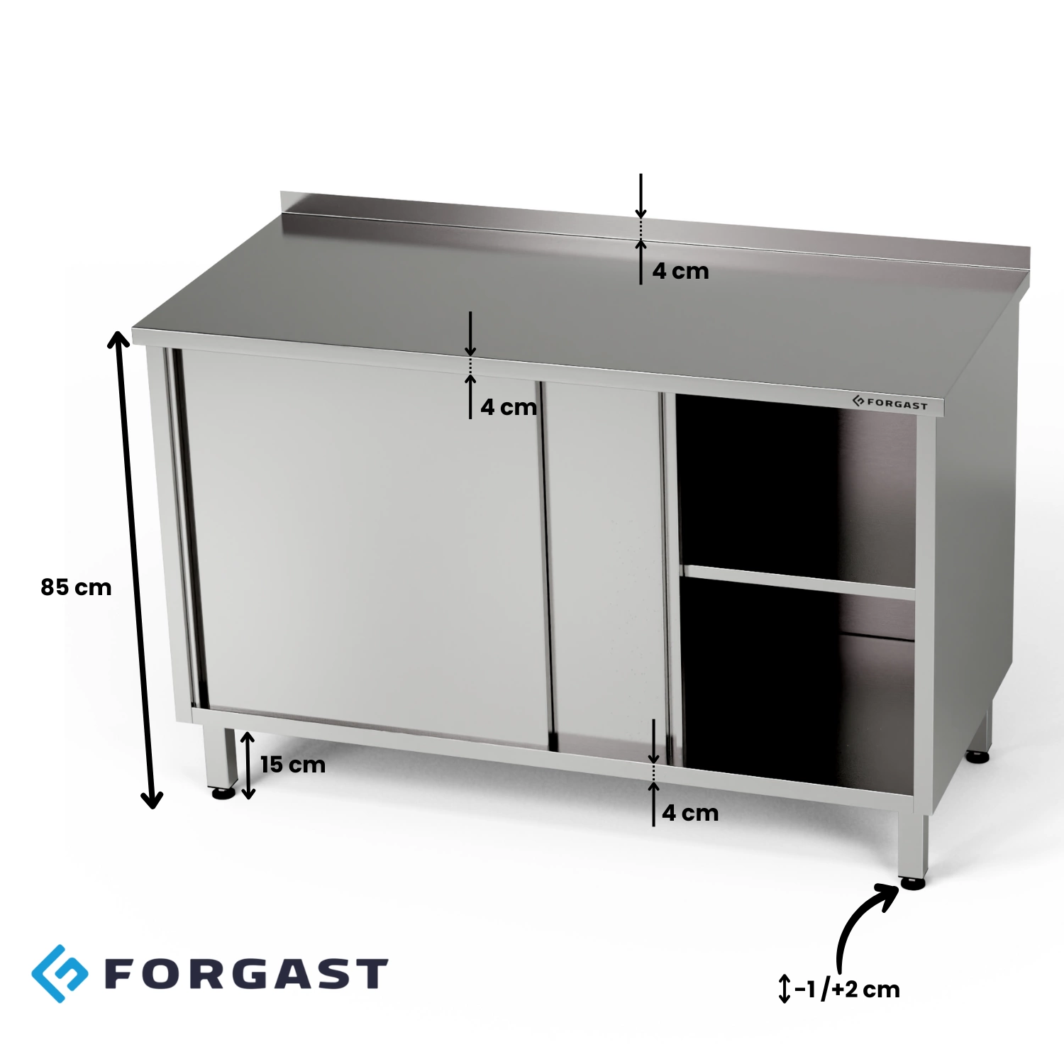 Pracovní stanice o rozměrech 110x60x85 cm se skříní s posuvnými dveřmi z nerezové oceli J4. Uvnitř skříně półka.