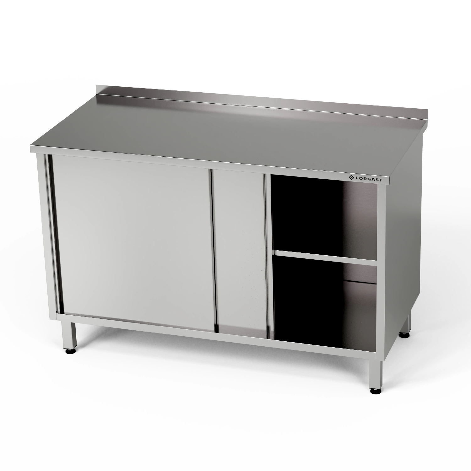 Pracovní stanice o rozměrech 150x70x85 cm se skříní s posuvnými dveřmi z nerezové oceli J4. Uvnitř skříně półka.