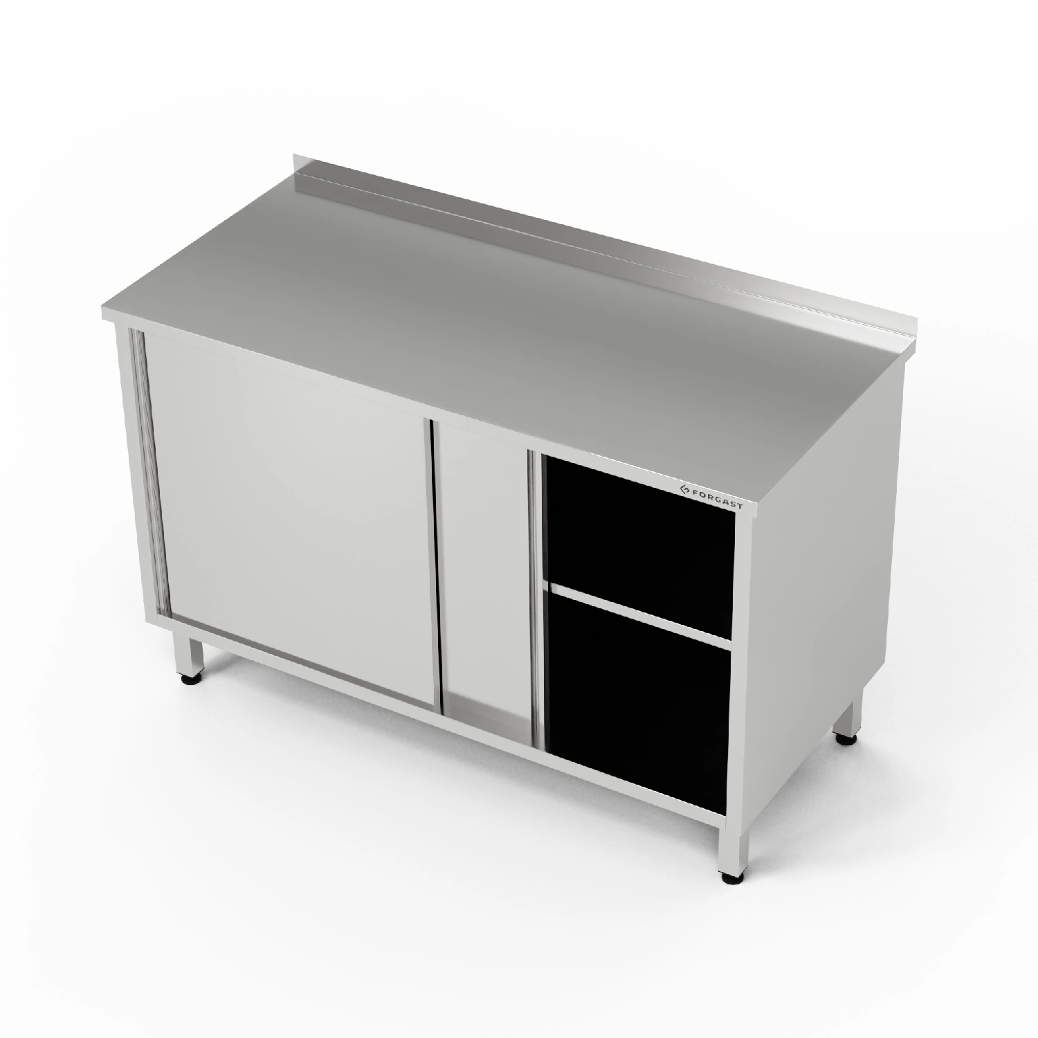 Pracovní stanice o rozměrech 160x60x85 cm se skříní s posuvnými dveřmi z nerezové oceli J4. Uvnitř skříně półka.