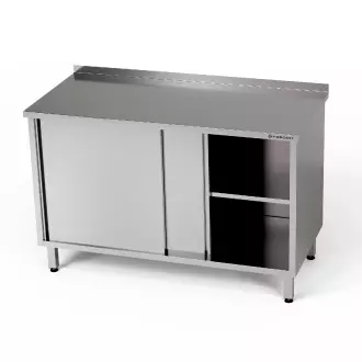 Pracovní stanice o rozměrech 190x70x85 cm se skříní s posuvnými dveřmi z nerezové oceli J4. Uvnitř skříně półka.