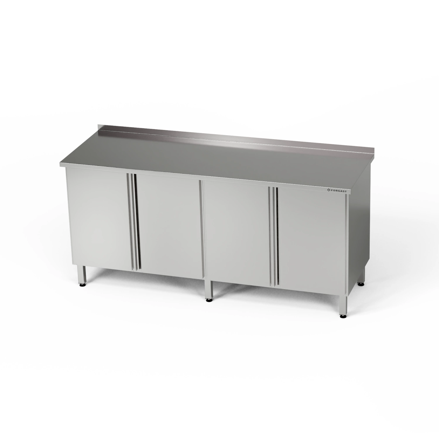 Pracovní stanice o rozměrech 210x70x85 cm se 2 skříňkami s otevíracími dvířky z nerezové oceli J4. Uvnitř skříněk je półka.