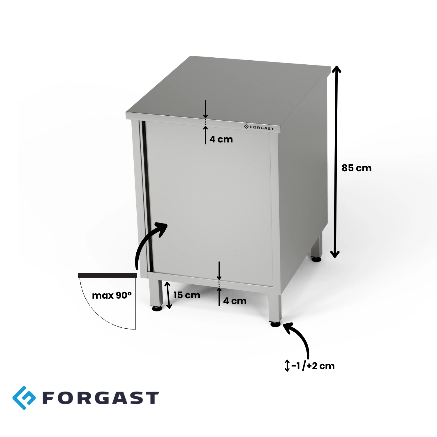 Pracovní stanice - skříňka s otevíracími dvířky, 60x60x85 cm. Uvnitř skříně je pólavice. Vyrobeno z nerezové oceli J4. Stó³³ může mít závěsy namontované na levé (L) nebo pravé (P) straně - uveďte prosím při objednávce.