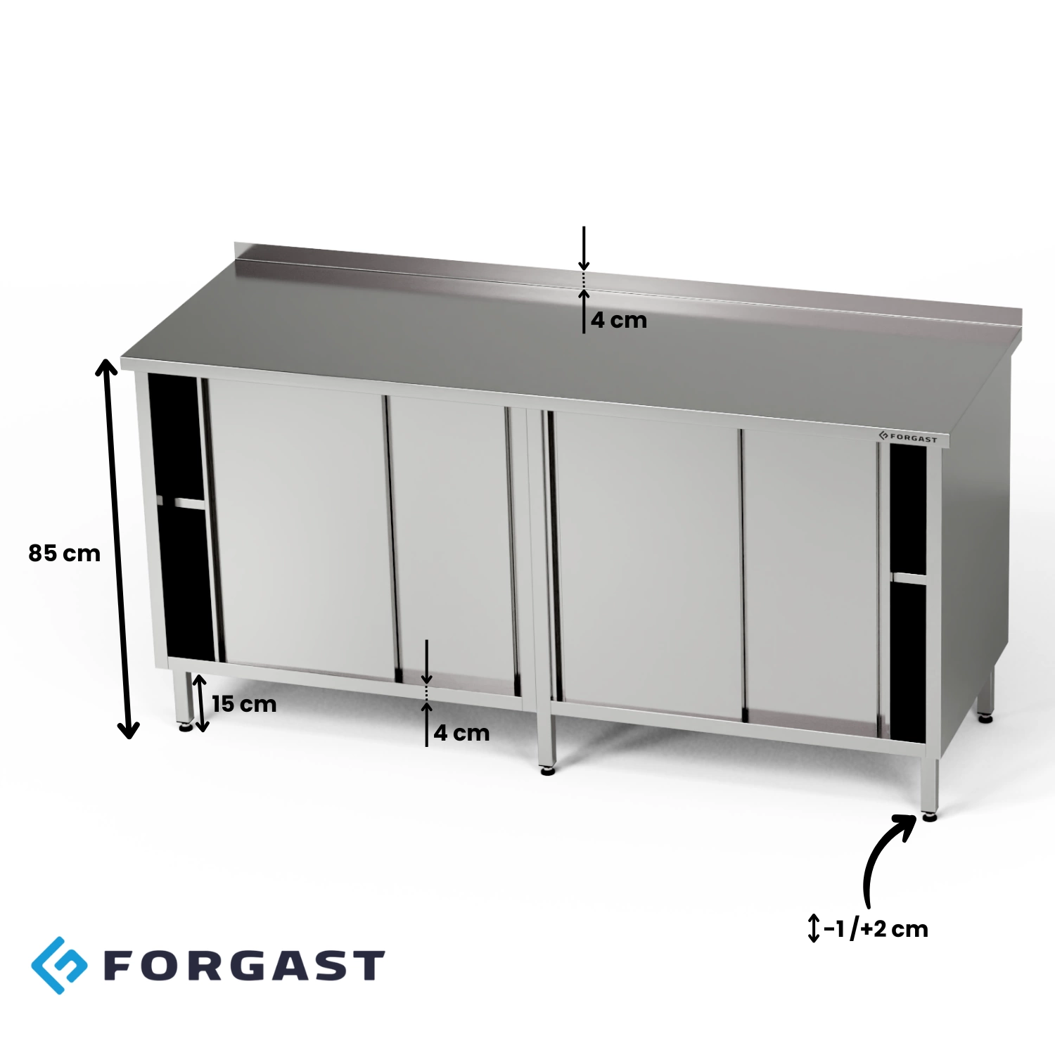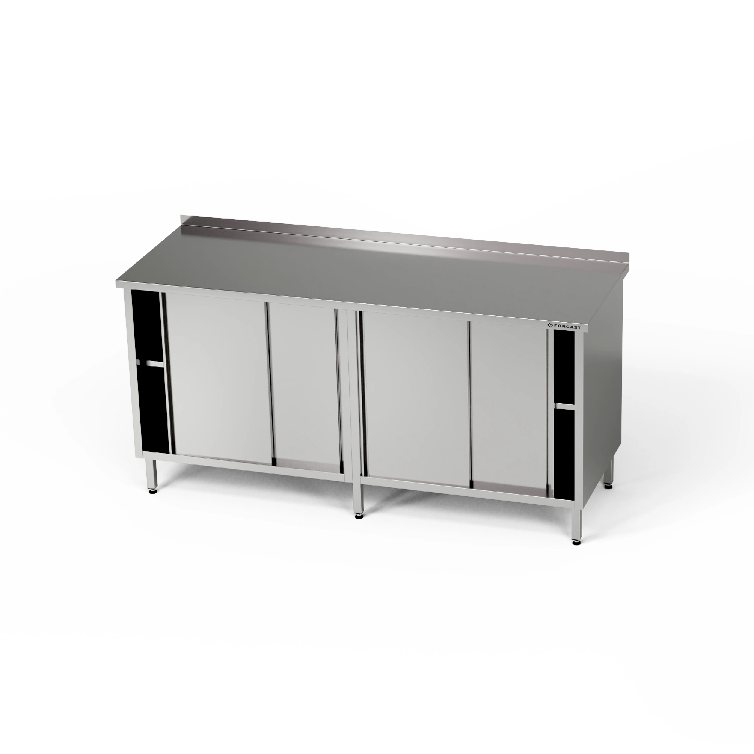 Pracovní stanice o rozměrech 180x60x85 cm se 2 skříňkami s posuvnými dveřmi z nerezové oceli J4. Uvnitř skříněk je półka.