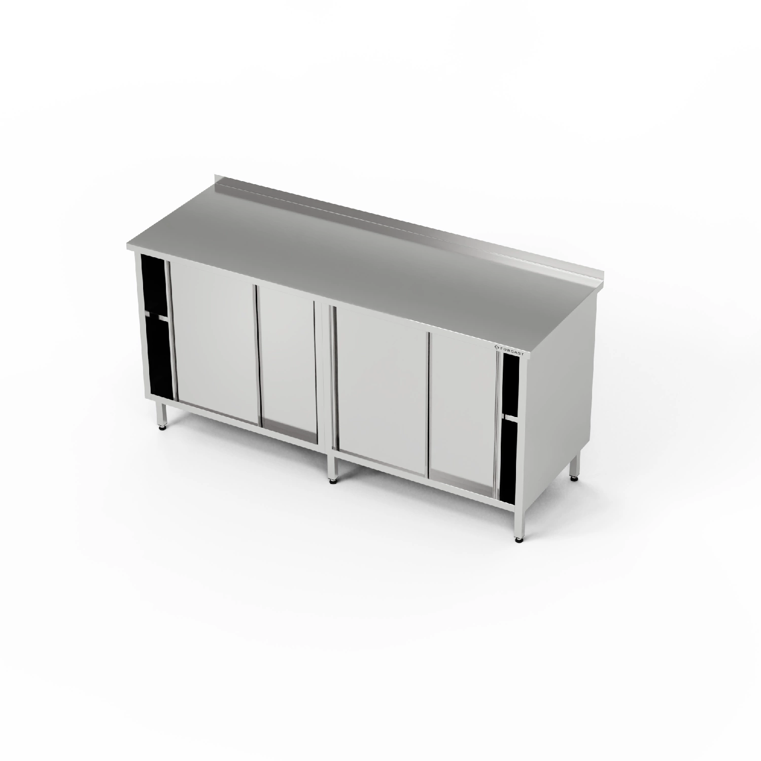 Pracovní stanice o rozměrech 180x70x85 cm se 2 skříňkami s posuvnými dveřmi z nerezové oceli J4. Uvnitř skříněk je półka.