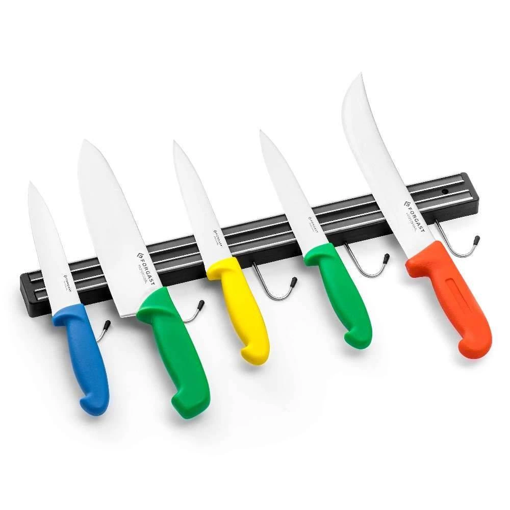 Magnetická lišta FORGAST FG11264 je ideálním řešením pro ty, kteří si cení pořádku a rychlého přístupu k nejdůležitějším kuchyňským nástrojům. Montáž na stěnu šetří místo v zásuvkách a silný magnet zajišťuje bezpečné uchycení nožů. Další háčky umožňují zavěšení kuchyňských nástrojů, které nejsou z kovu, například silikonových obraceček nebo dřevěných kleští. Tento produkt se osvědčí v intenzivně využívaných restauracích, kde je důležitá ergonomie práce a bezpečnost.