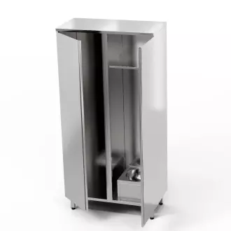 Dvojitá úložná skříňka s umyvadlem o rozměrech 100x50x180 cm z nerezové oceli J4. Možnost volby dřezové mísy na pravé nebo levé straně. Větrací otvory. Nastavitelná police. Háčky na oblečení umístěné na opačné straně než prostor dřezu.