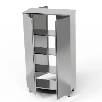 Průchozí skříň o rozměrech 100x60x180 cm z nerezové oceli J4. Skříň je vybavena 3 pólavicemi. Křídlové dveře.