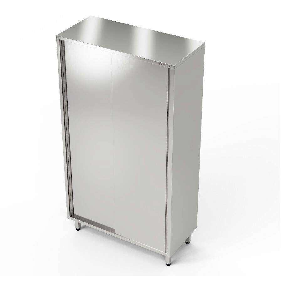 Úložná skříň o rozměrech 90x50x200 cm z nerezové oceli J4. Skříň má 3 pólavice. Posuvné dveře.