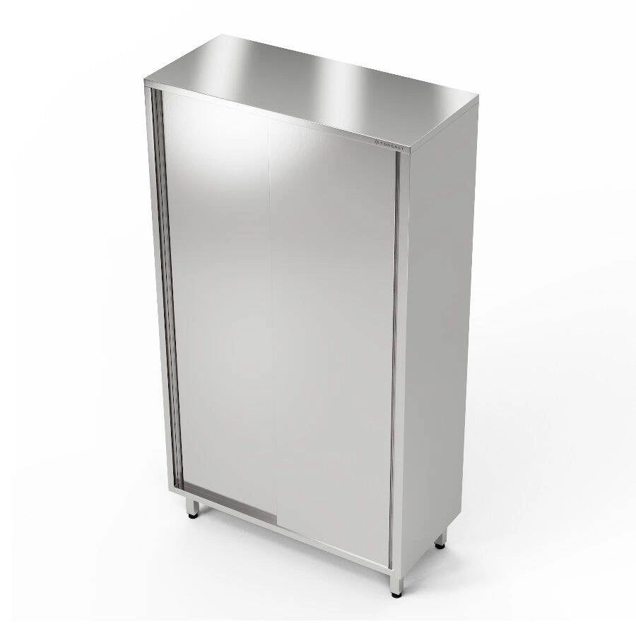 Úložná skříň o rozměrech 110x50x200 cm z nerezové oceli J4. Skříň má 2 pólavice. Posuvné dveře.
