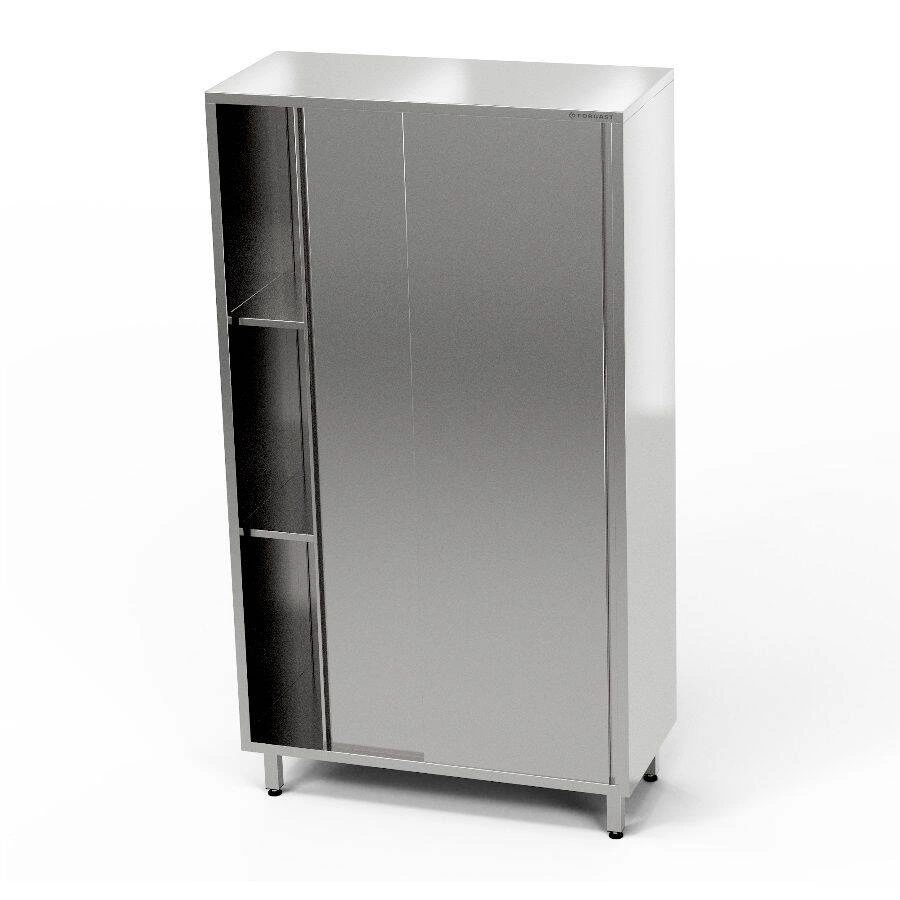 Úložná skříň  o rozměrech 120x50x180 cm z nerezové oceli J4. Ve skříni jsou 2 pólavice. Posuvné dveře.