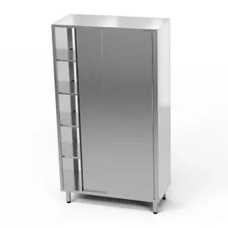 Průchozí šatní skříň  o rozměrech 110x70x200 cm z nerezové oceli J4. Skříň má 4 pólavice. Posuvné dveře.