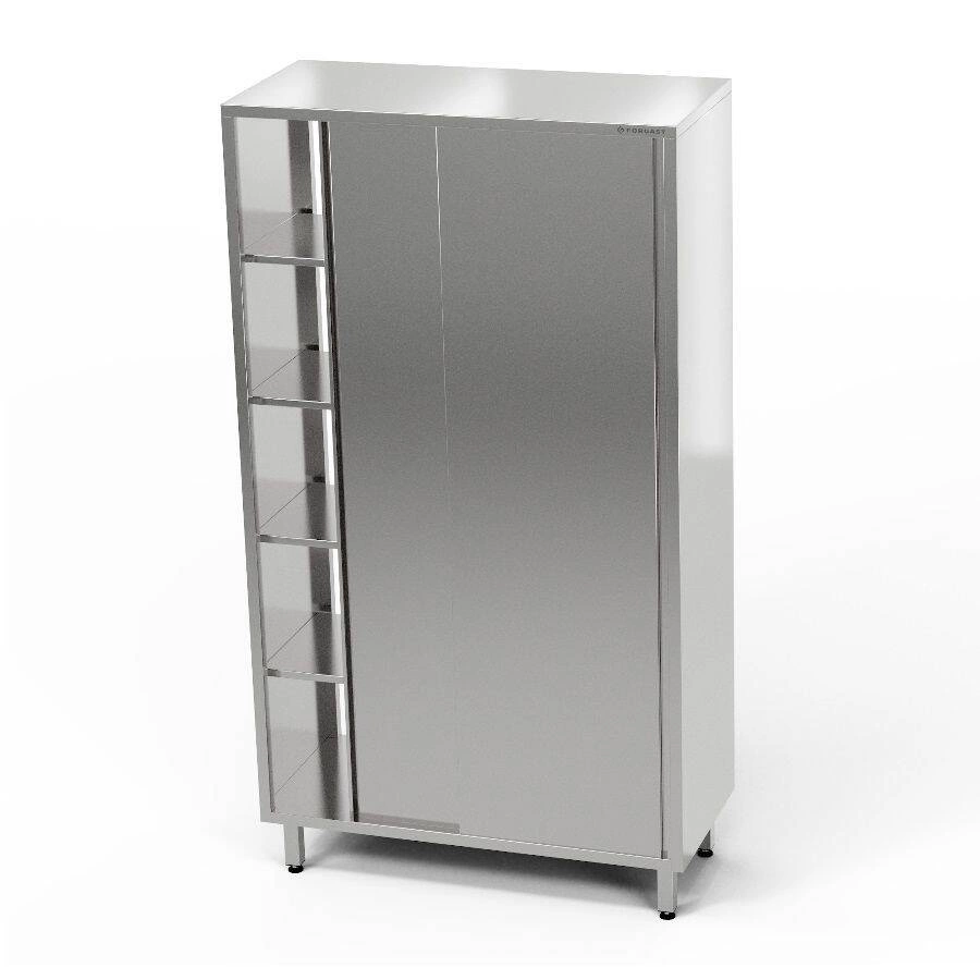 Průchozí šatní skříň  o rozměrech 130x60x180 cm z nerezové oceli J4. Skříň má 4 pólavice. Posuvné dveře.