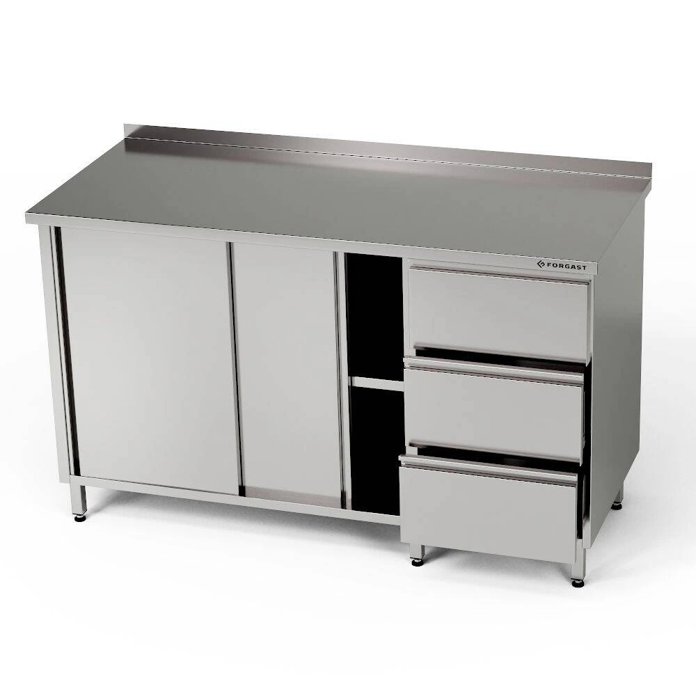 Pracovní stanice o rozměrech 150x60x85 cm s blokem 3 zásuvek a skříňkou s posuvnými dveřmi. Uvnitř skříně je pólavice. Vyrobeno z nerezové oceli J4. Skříňka může být umístěna na levé nebo pravé straně.  Rozměry zásuvky v bloku se 3 zásuvkami: 46,5x21,5x44/13 cm.