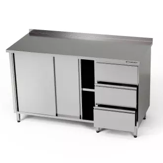 Pracovní stanice o rozměrech 220x70x85 cm s blokem 3 zásuvek a skříňkou s posuvnými dveřmi. Uvnitř skříně je pólavice. Vyrobeno z nerezové oceli J4. Skříňku lze umístit na levou nebo pravou stranu. Rozměry zásuvkového bloku se 3 zásuvkami: 46,5x21,5x44/13 cm.