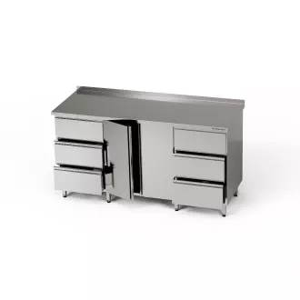 Pracovní stanice o rozměrech 220x70x85 cm se 2 bloky po 3 zásuvkách a skříňkou s otevíracími dvířky. Uvnitř skříňky je półka. Vyrobeno z nerezové oceli J4. Skříňka uprostřed, mezi blokem zásuvek. Rozměry zásuvek v bloku 3 zásuvek: 46,5x21,5x44/13 cm.